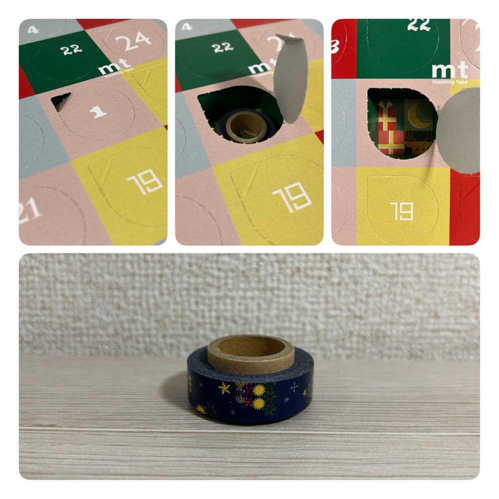 初日なので開ける瞬間の写真も撮ってみた✌1日目は記号マークのクリスマスツリー柄マステでした いいね〜🎄ちょい細めなのが可愛いし芯があるタイプなのレア感ある!あと開けた部分の箱の柄もかわゆ〜