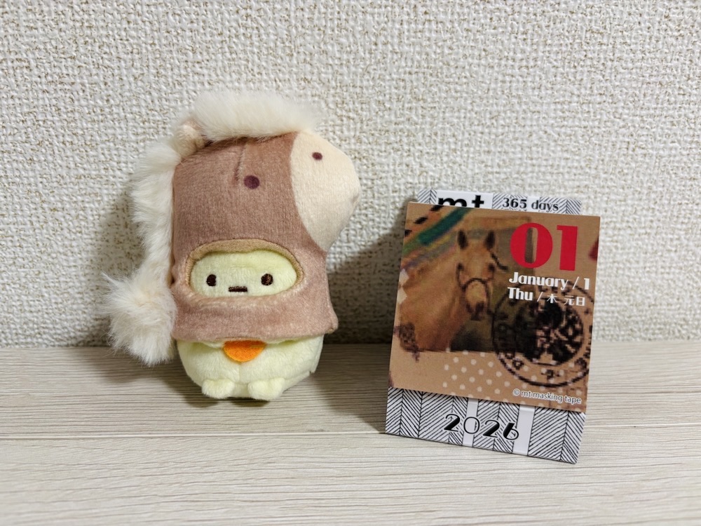 日付的には昨日なんですけどmtの日めくりカレンダーの初日が馬だったのでたぴおか(馬)のぬいと一緒に撮りました かわいいね🐴 #すみっコ