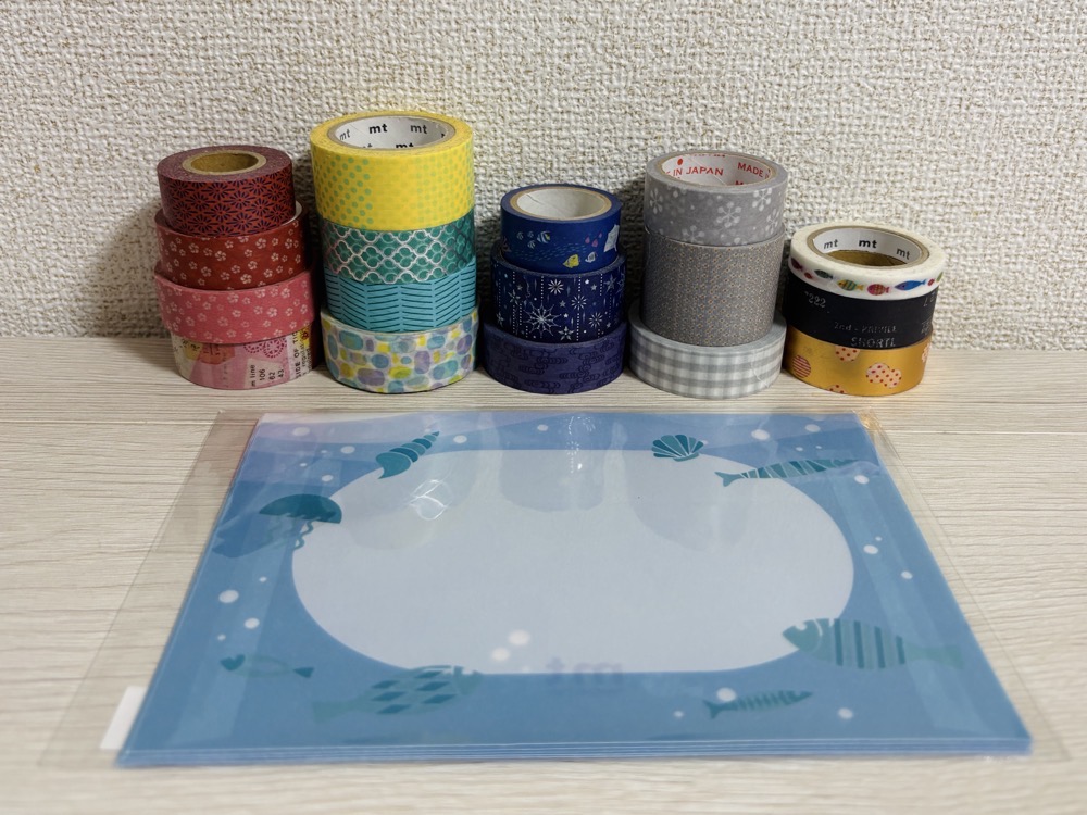 あと本当は背景にグレー系の紙を使う予定だったんですが、探しても見当たらなかったのでmtが出してるトレペ封筒でめちゃピッタリな柄を発見したのでそちらを使ってみました🪼自分のマステ絵が小さめなのでちょうどいい感じに配置できて良かったです✌